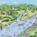 ヘッダーイラストでは、大台町の山から川へとつながる自然の流れを横長構図で描き、町全体の生態系がひとつながりであることを視覚的に表現しました。