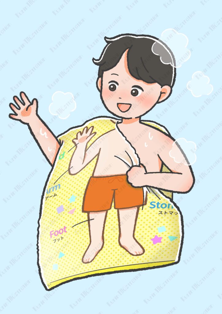 タオルに印刷される人物イラストと、使用シーンの子どもの描写が混同しないよう、