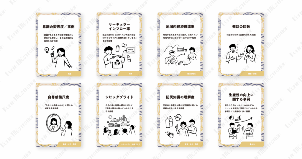 たとえば「参加意欲」や「地域幸福度指数」などの指標に対して、短い補足文と、それをイメージしやすくするシンプルなイラストを組み合わせています。