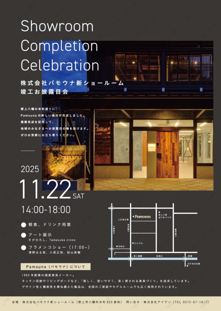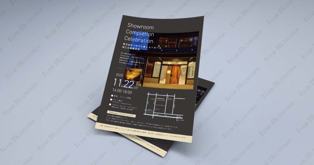 株式会社アイゲン様より、家具メーカーPamouna様の新ショールーム完成に伴う「竣工お披露目会」告知チラシのご依頼をいただきました。
